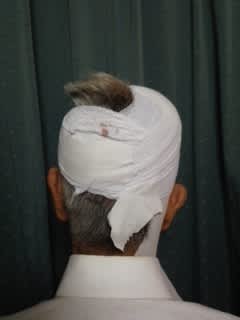(1)後頭部座裂創。傷は小さい。5日前に抜糸した。かさぶたをいじるとまだ出血する。